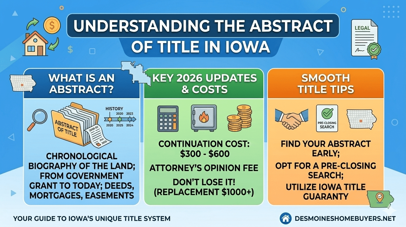 - The Abstract Continuation: You must pay an abstract company (like Iowa Title Company or Polk County Abstract) to search the records since you bought the house and add those new pages to the book.